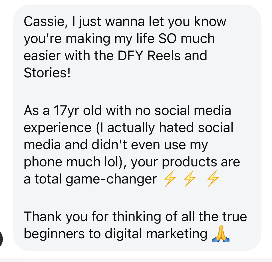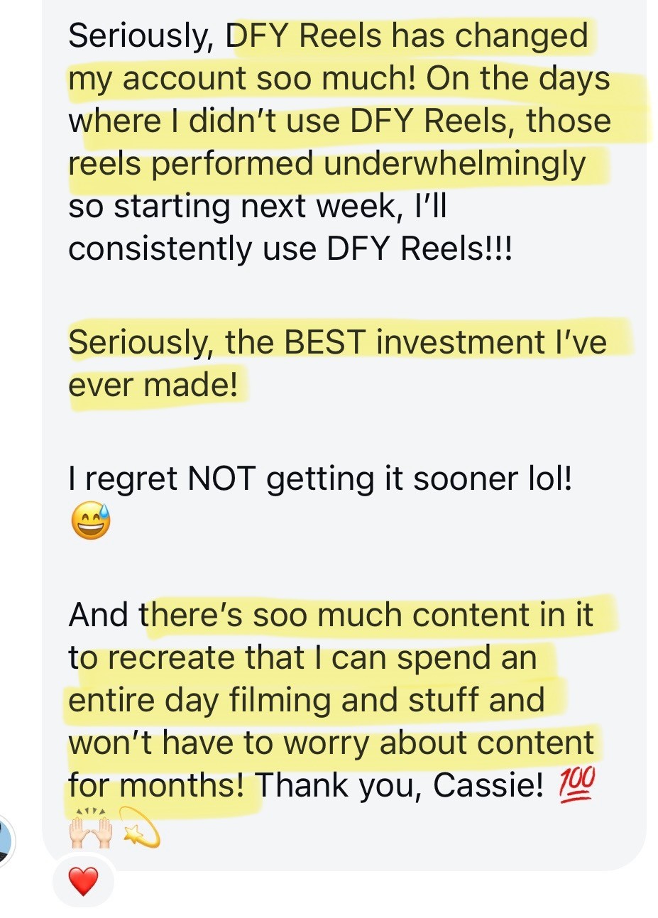 While the DFY Reel templates are fully done-for-you in terms of structure and ideas, you will still need to create and edit the Reels yourself.